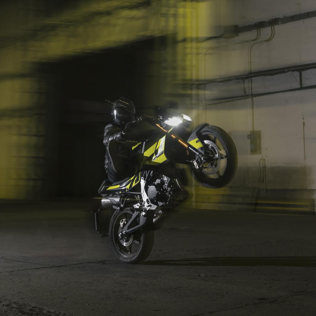 Sharp, muscular lines, a sculpted tank and compact proportions convey energy even at a standstill. The mixed steel-aluminium frame, aluminium swingarm and removable rear subframe create a modern, agile and robust structure.