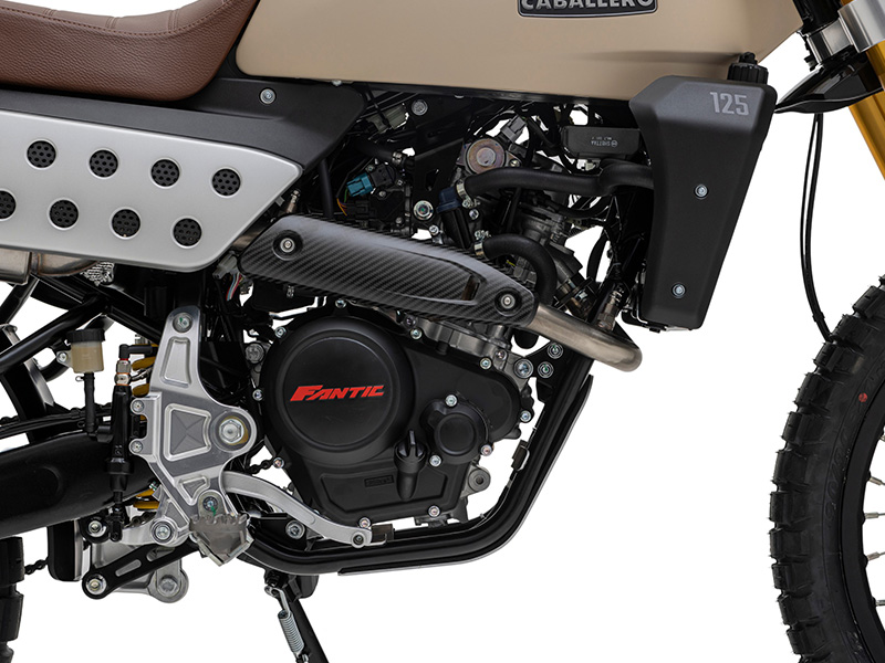 The engine intake system, featuring an optimized airbox, is designed to ensure instant power and torque delivery, improving the overall performance and responsiveness of the Caballero 125 Rally across any type of terrain.