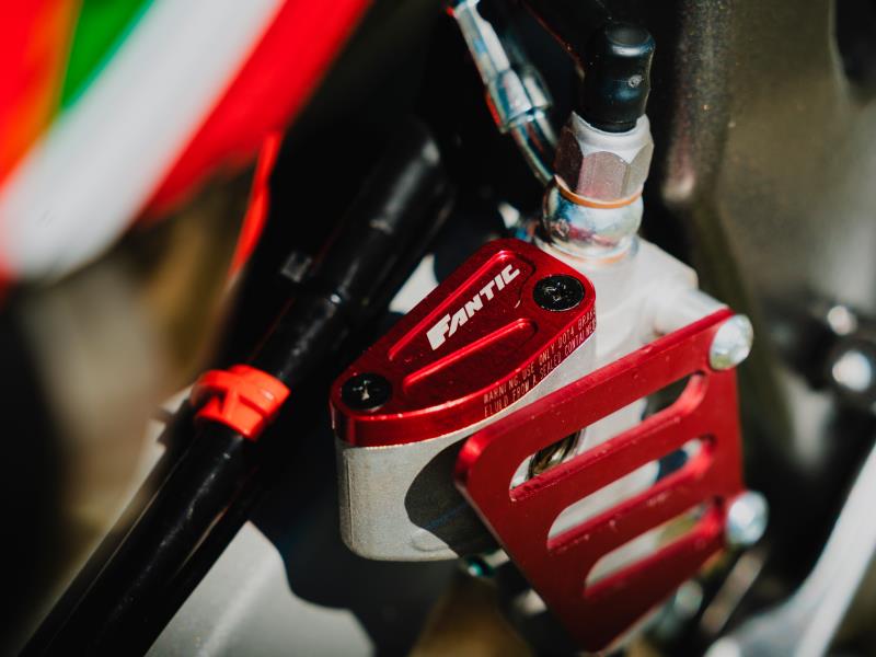 Racing components: Red anodized Fantic parts: brake pump covers (front and rear), rear brake pump guard, handlebar, forks