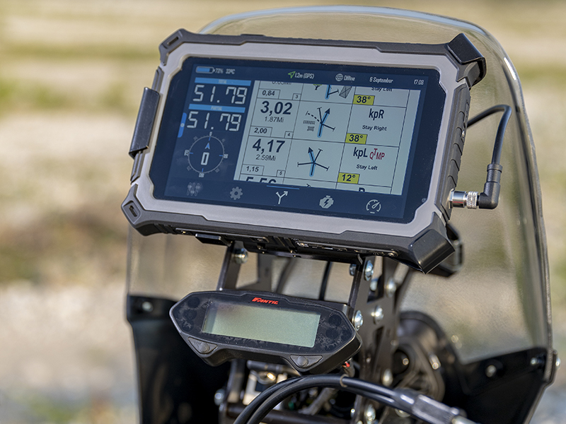 Everything under control. Thanks to our 7” RallyScreen you will be able to easily check GPX tracks, digital roadbooks and use any of the navigation apps on the market, either via the touchscreen or the two controls on the handlebar.